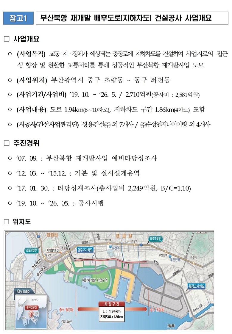 특히, 지하차도를 이용할 때 ‘충장고가교 종점부’와 ‘부산세관’ 사이의 주요 교차로(3부두・4부두 교차로) 2곳을 정차 신호 없이 지하로 통과하게 되어 해당 구간 통과 시간이 대폭 단축될 것으로 전망된다.