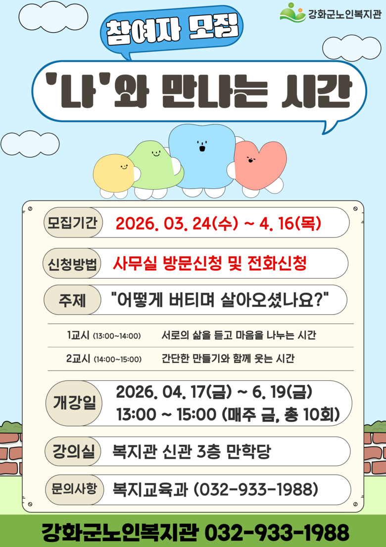 [강화군 세계타임즈=심하린 기자] 강화군노인복지관(관장 윤심)이 어르신들의 정서적 안정과 사회적 관계 형성을 지원하는 이야기 나눔 모임 「‘나’와 만나는 시간」의 참여자를 모집한다고 밝혔다.