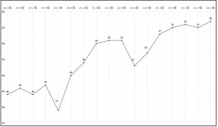 이번 성과는 국내외 금융 여건이 어려운 상황에서도 달성한 것으로 2014년 이후 최고 성적이다. 또한 2023년 3월(37위) 대비 14단계 상승했으며, 2024년 3월(상반기) 이후 5회 연속 20위권을 유지하며 안정적인 상승세를 이어가고 있다.