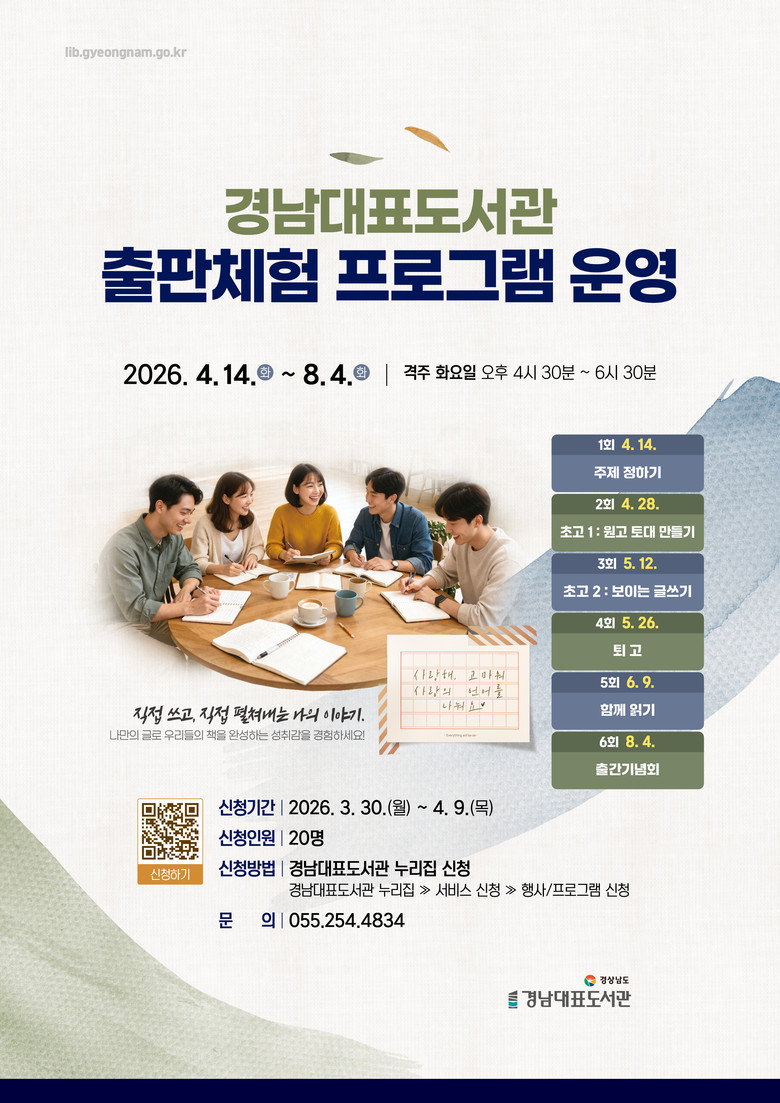 글쓰기와 책 만들기에 관심 있는 도민이라면 누구나 신청 가능하며, 모집 인원은 총 20명이다. 참여 희망자는 3월 30일부터 4월 9일까지 경남대표도서관 누리집(https://lib.gyeongnam.go.kr)을 통해 온라인으로 접수할 수 있다.
