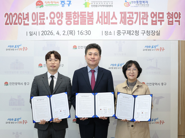 [중구 세계타임즈=심하린 기자] 인천시 중구(구청장 김정헌)는 촘촘하고 든든한 ‘지역사회 통합돌봄망’ 구축을 위해 지난 2일 제2청 구청장실에서 복지 서비스 제공기관, 의료기관과 잇따라 업무 협약을 체결했다고 밝혔다.