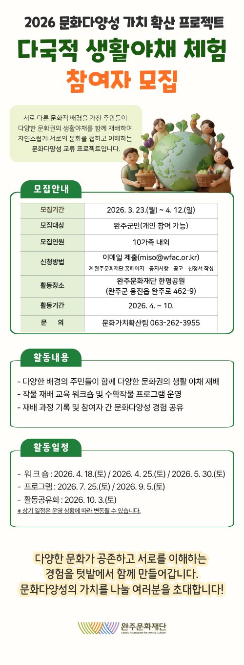 모집 대상은 완주군민으로 개인 참여가 가능하며, 모집 인원은 10가족 내외이다. 활동 기간은 2026년 4월부터 10월까지이며, 참가 신청은 3월 23일부터 4월 12일까지 이메일로 접수한다. 참여자는 신청 순서에 따라 요건 확인 후 선착순으로 선정되며, 자세한 사항은 완주문화재단 홈페이지 공고를 통해 확인할 수 있다.
